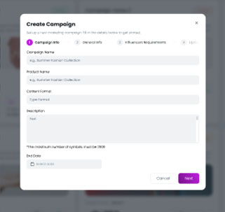 Build your campaign with all the required details: target audience, deliverables, budget, and timeline. Our intuitive platform makes brief creation simple and clear.